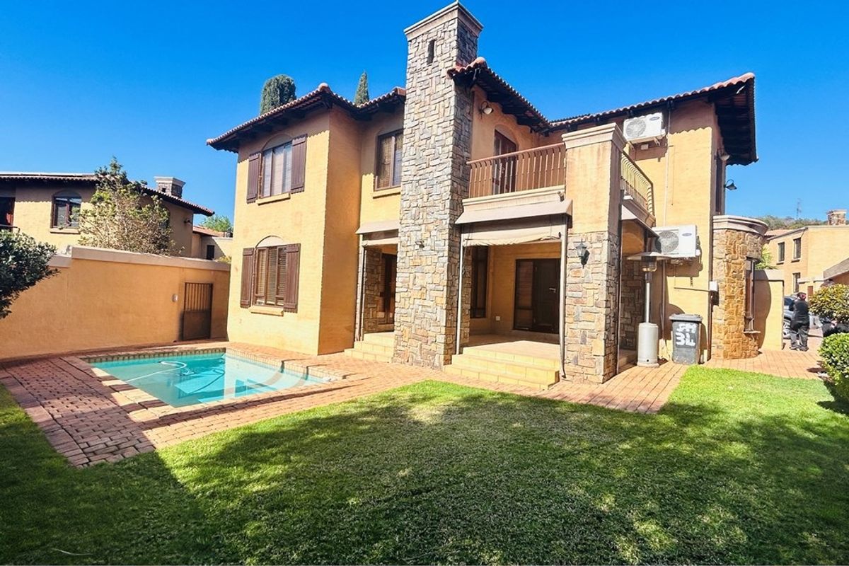 Effortless entertaining and serene living in Stone Manor at Pierneef Koppie, minutes from Lynnwood Bridge and shops, Tuscan-style home with heated swimming pool, three bedrooms and two baths.