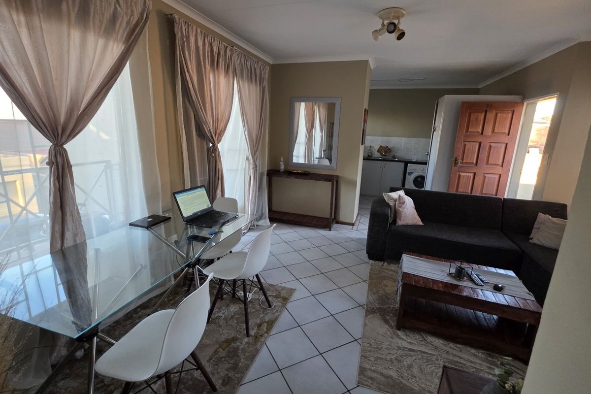 Relaxed suburban living in Magalieskruin, steps from malls, schools and hospitals. Open-plan lounge leads to a balcony with built-in braai; two bedrooms, one bath and covered parking.