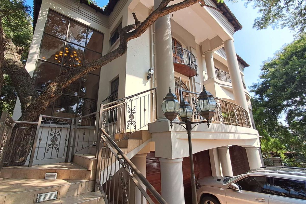 Entertain effortlessly in Magalieskruin's leafy setting — expansive landscaped grounds, private cinema and jacuzzi patio, elevator access throughout; four bedrooms, four-and-a-half bathrooms and four garages.