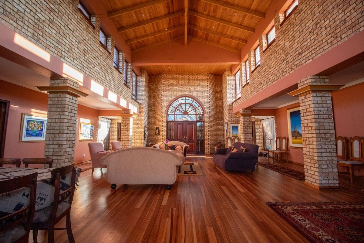Enter through double-volume wooden doors into a light-filled home with high ceilings and large windows, which allow in natural warmth and brightness. The view extends to a beautifully manicured garden, framed by a covered patio that features both a built-in wood braai and a built-in gas braai, ideal for year-round entertaining.