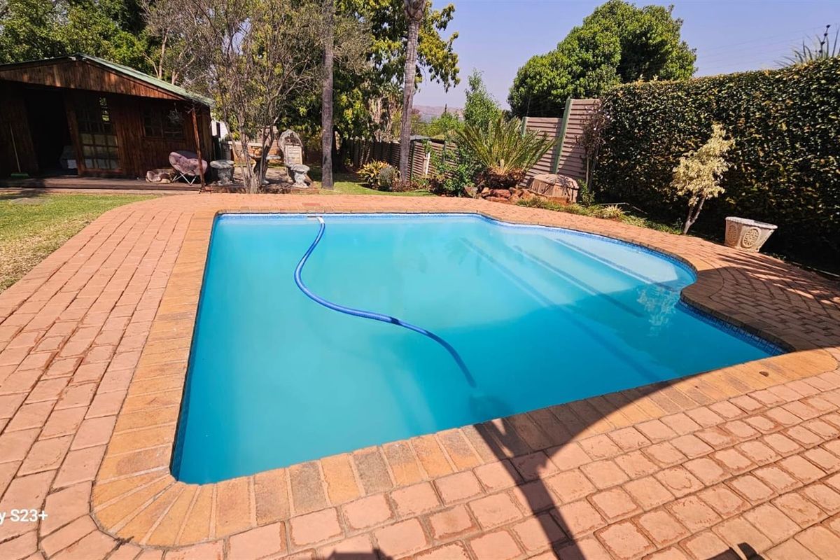 Relax in peaceful Mountain View, Pretoria living — tree-lined streets and nearby parks; indoor sunlit pool, landscaped yard and five bedrooms with 4.5 bathrooms for family comfort.