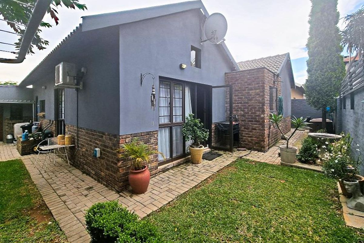 Effortless entertaining and family comfort in Boardwalk-Olympus, East Pretoria, near Woodlands Mall and Menlyn Maine — patio with built-in braai, small pool, wrap-around garden; three bedrooms, two bathrooms, double garage.