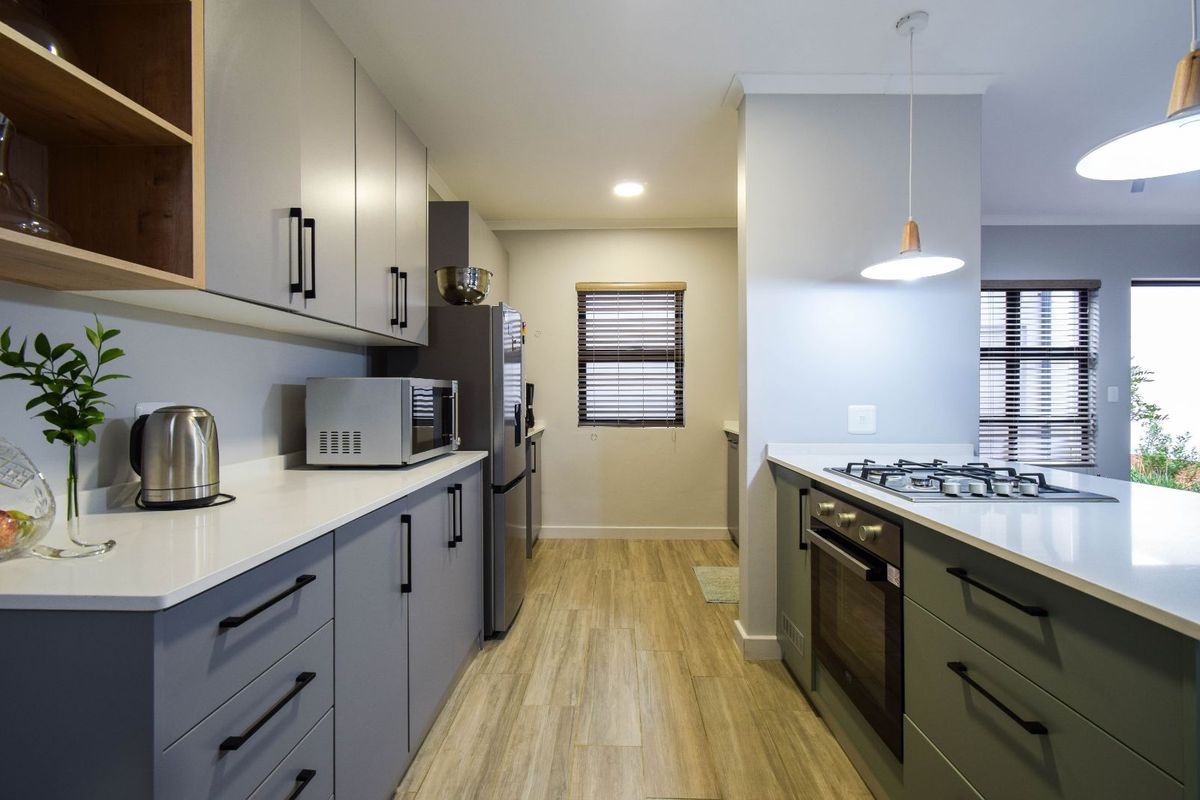 On entering the home, one is welcomed into an open-plan living and dining area, designed for ease and everyday enjoyment. The floors are finished in wood-look tiles, adding a sense of warmth throughout. The kitchen is both practical and attractive, fitted with Caesarstone countertops and olive green cupboards. It includes a gas hob with four plates, an undercounter oven, and space for a fridge and dishwasher, while the washing machine connection is neatly arranged in the garage. A guest toilet is also conveniently located on this level, along with a fitted alarm unit.
