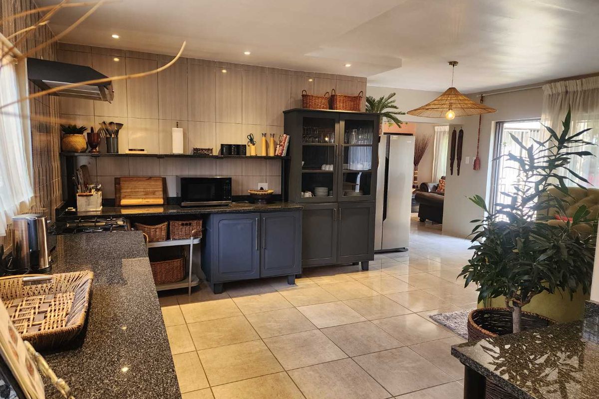 The townhouse offers a semi open-plan layout with a modern kitchen fitted with a gas stove, under-counter washing machine and tumble dryer, making daily living and guest turnover equally effortless. The living area flows into a spacious private front section with a dedicated braai and entertainment area, ideal for relaxed family living or hosting guests.