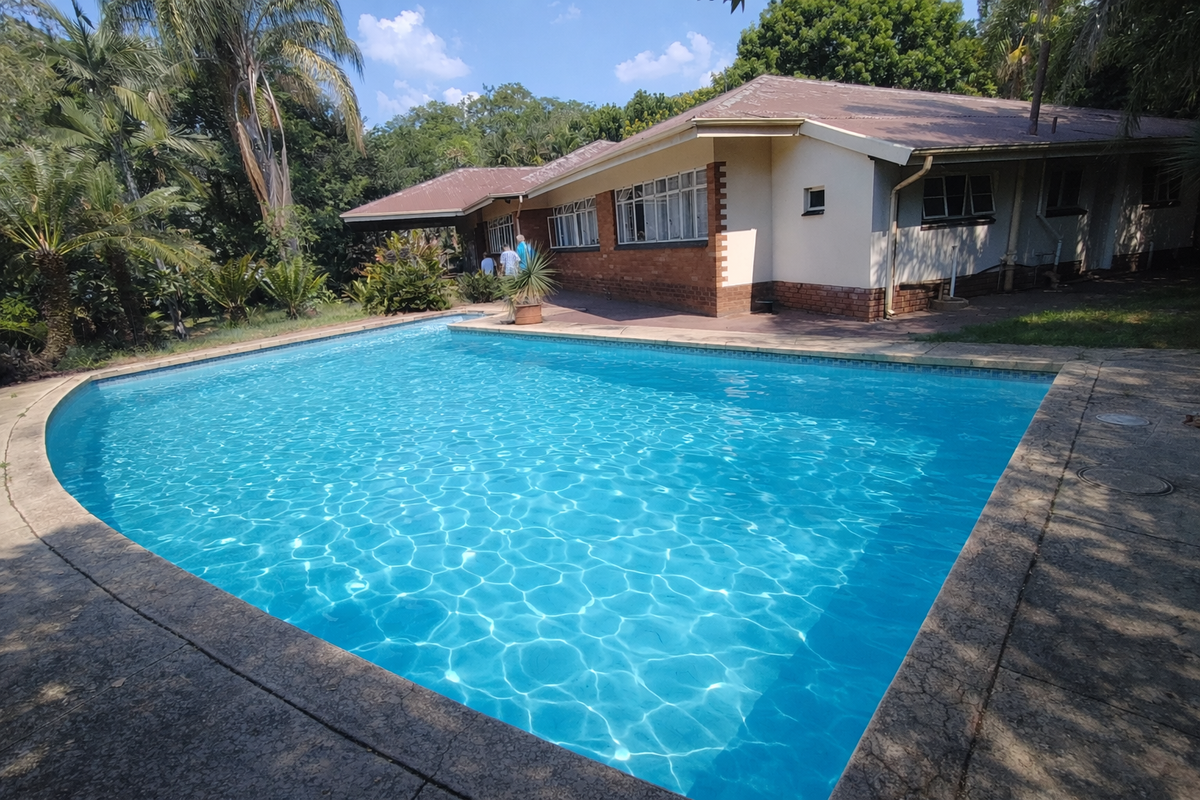 Ideal for family living and entertaining in well-established Pretoria North near Berg Avenue, on a 2552m² stand with extra-large pool, one-bed flat and four bedrooms, two bathrooms.