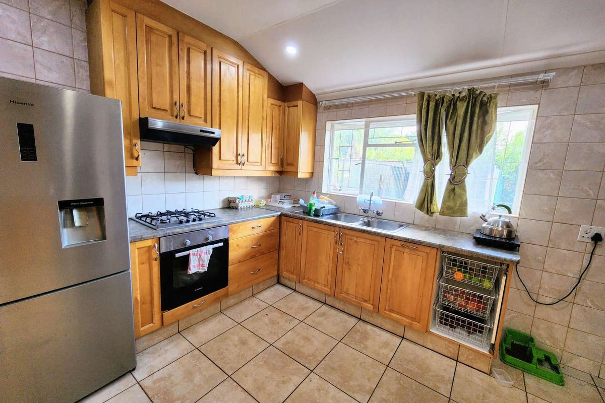The heart of the home features a massive open-plan lounge and dining area, fitted with a large air conditioner to ensure year-round comfort for the whole family. For the home chef, the extra-large kitchen is a standout, boasting an abundance of cabinetry, a gas stove, an electrical oven, and a double basin. A dedicated laundry room provides ample space for both a washing machine and a tumble dryer, keeping the main living areas clutter-free.