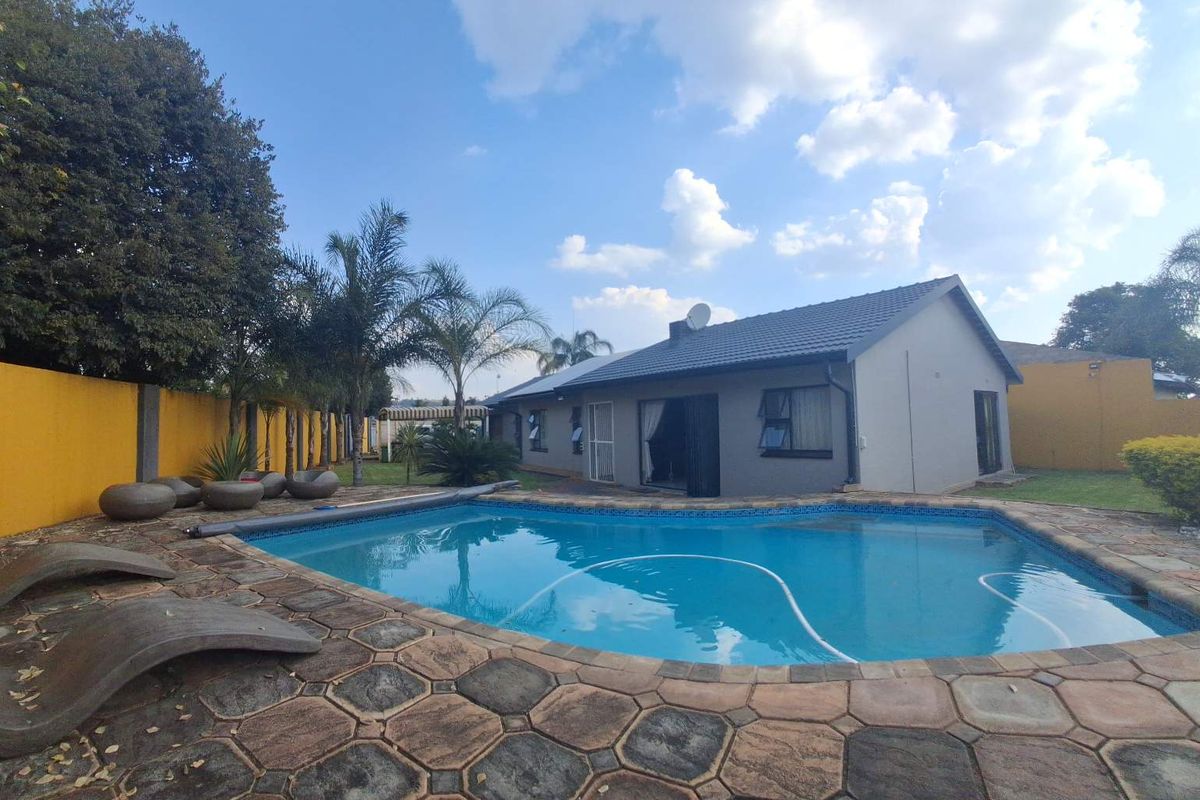The outdoor space is a standout feature, offering a large garden ideal for family living, pets, or future expansion. The striking blue swimming pool, complete with a sun deck, creates a perfect setting for both entertaining and relaxation.