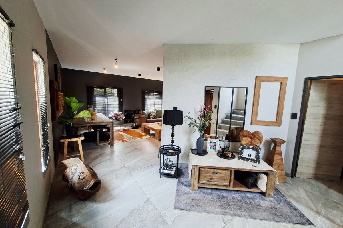The indoor-outdoor flow is effortless: sliding doors lead from the kitchen to a private patio featuring a built-in braai and a dedicated boma area, perfect for starlit evenings with friends and family. A chic guest bathroom completes the lower level.