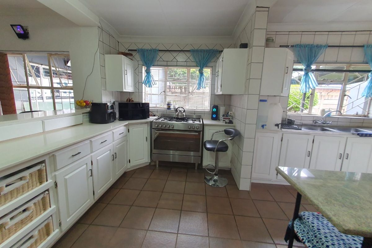 Entertainer’s dream in a quiet, leafy neighbourhood with indoor pool and built-in braai, generous garden and double garage — six bedrooms and four bathrooms.