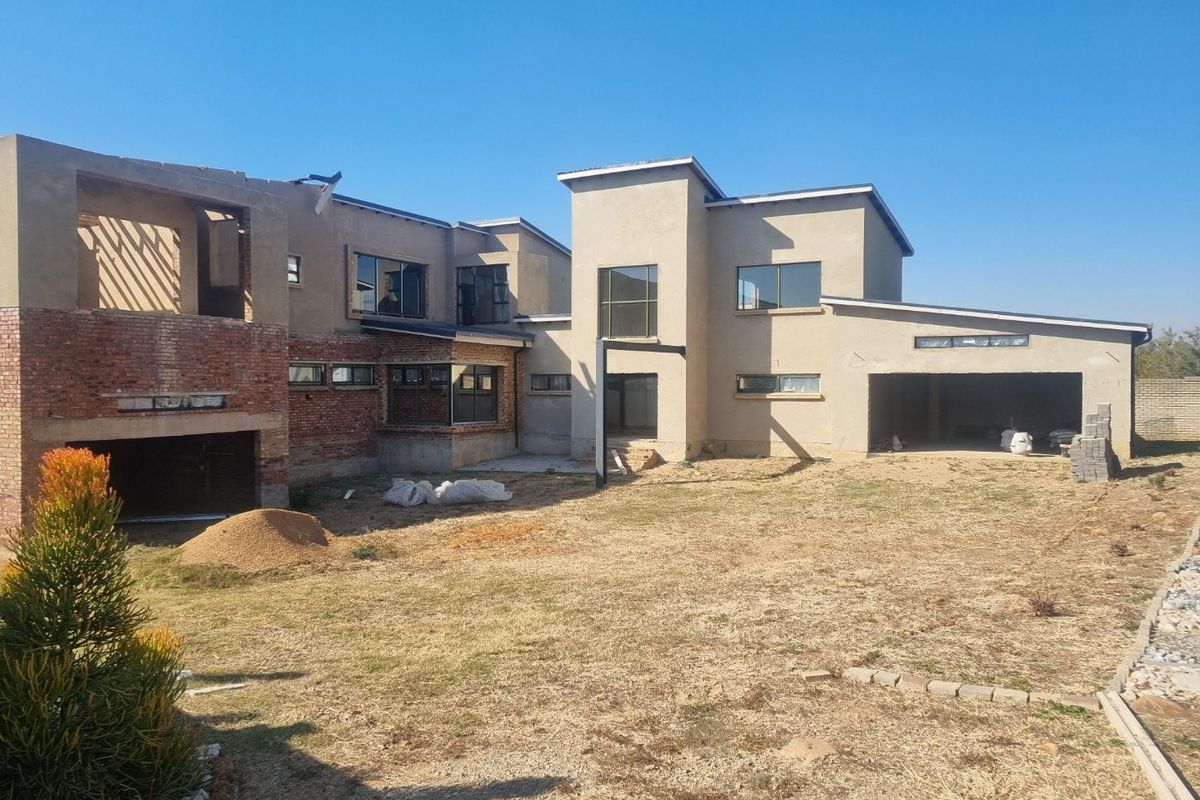 Entertainer's dream on expansive 2,500 m²: dual theatre rooms with bars, semi-covered pool beside a braai patio, basement guest and staff quarters; five en-suite bedrooms.