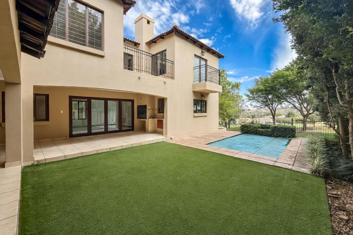 Relaxed golf-course living in prestigious Waterkloof Golf Estate, with expansive entertaining terraces and private swimming pool; contemporary double-storey home offering four bedrooms, five baths and double garage.