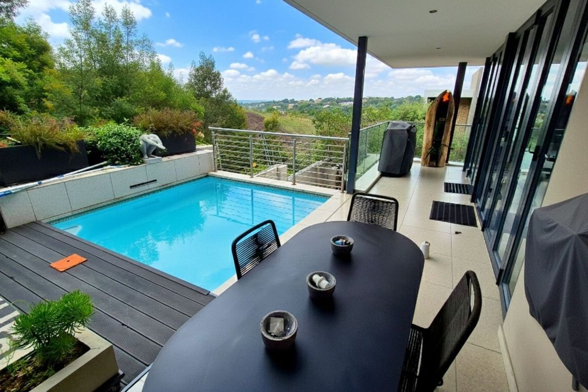 Secluded, green-living lifestyle on Waterkloof Ridge with private nature-reserve outlook and 180° views, off-grid power, gourmet entertaining level; three bedrooms, three bathrooms, four-car garage.