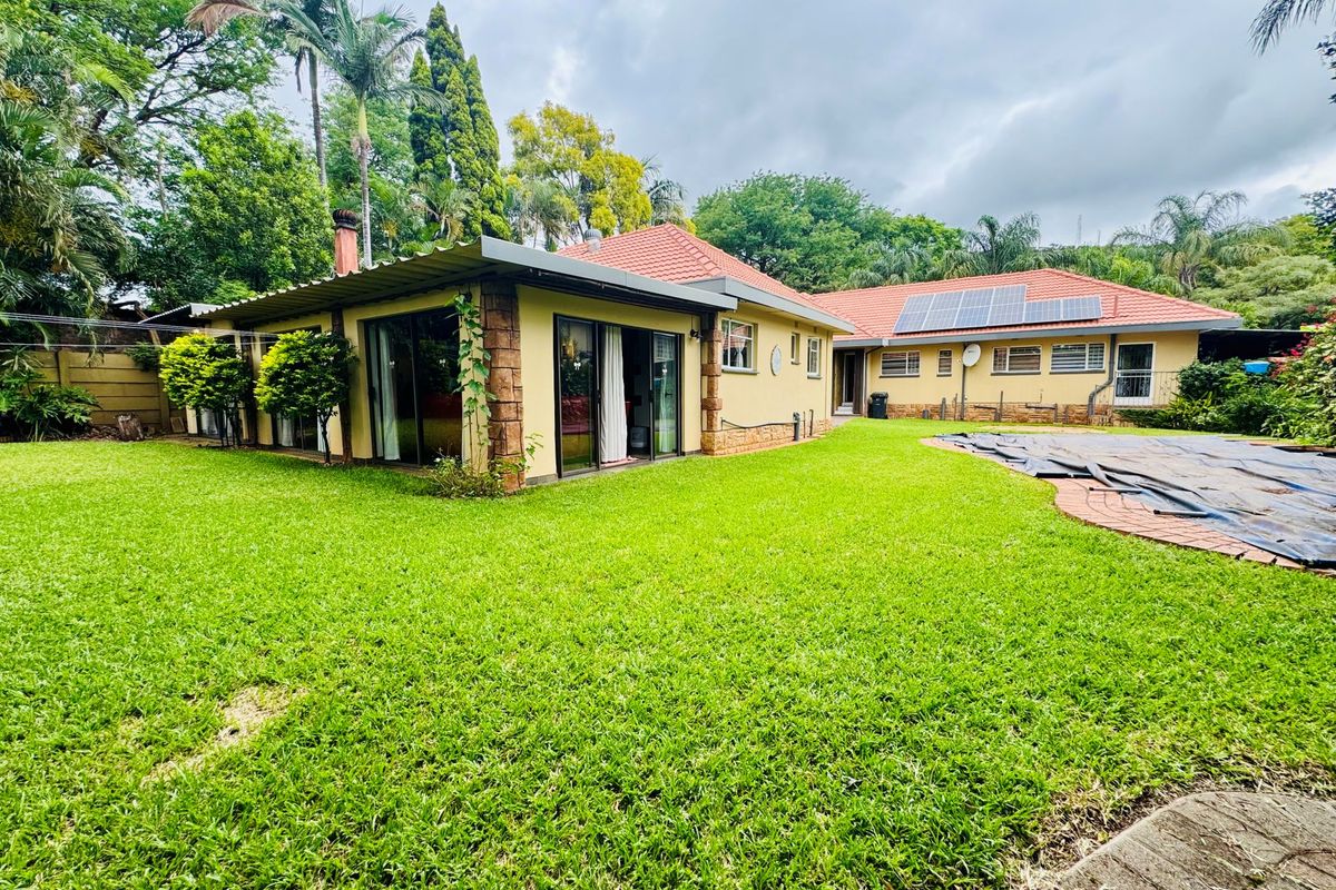 Entertainer's dream in a peaceful suburban enclave, with expansive garden, covered swimming pool and enclosed lapa with bar — three bedrooms, two-and-a-half baths and double garage.