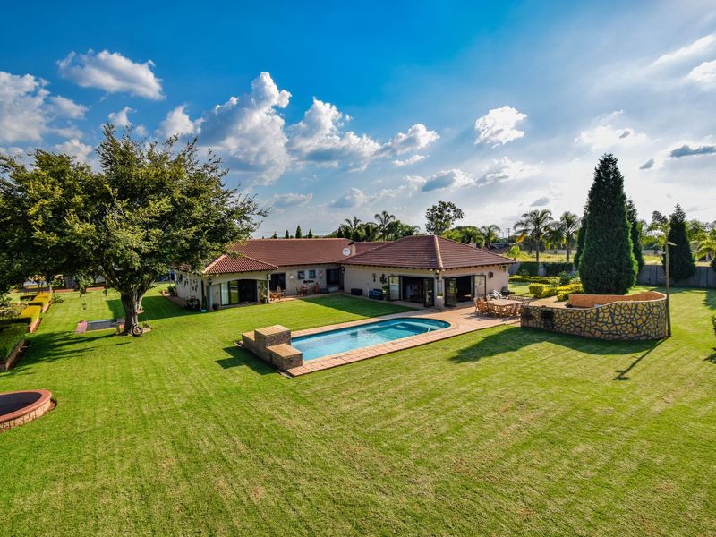 Entertain effortlessly in a sought-after Pretoria East estate, with flowing open-plan living and a built-in braai entertainment area — five bedrooms, five bathrooms, double garage.