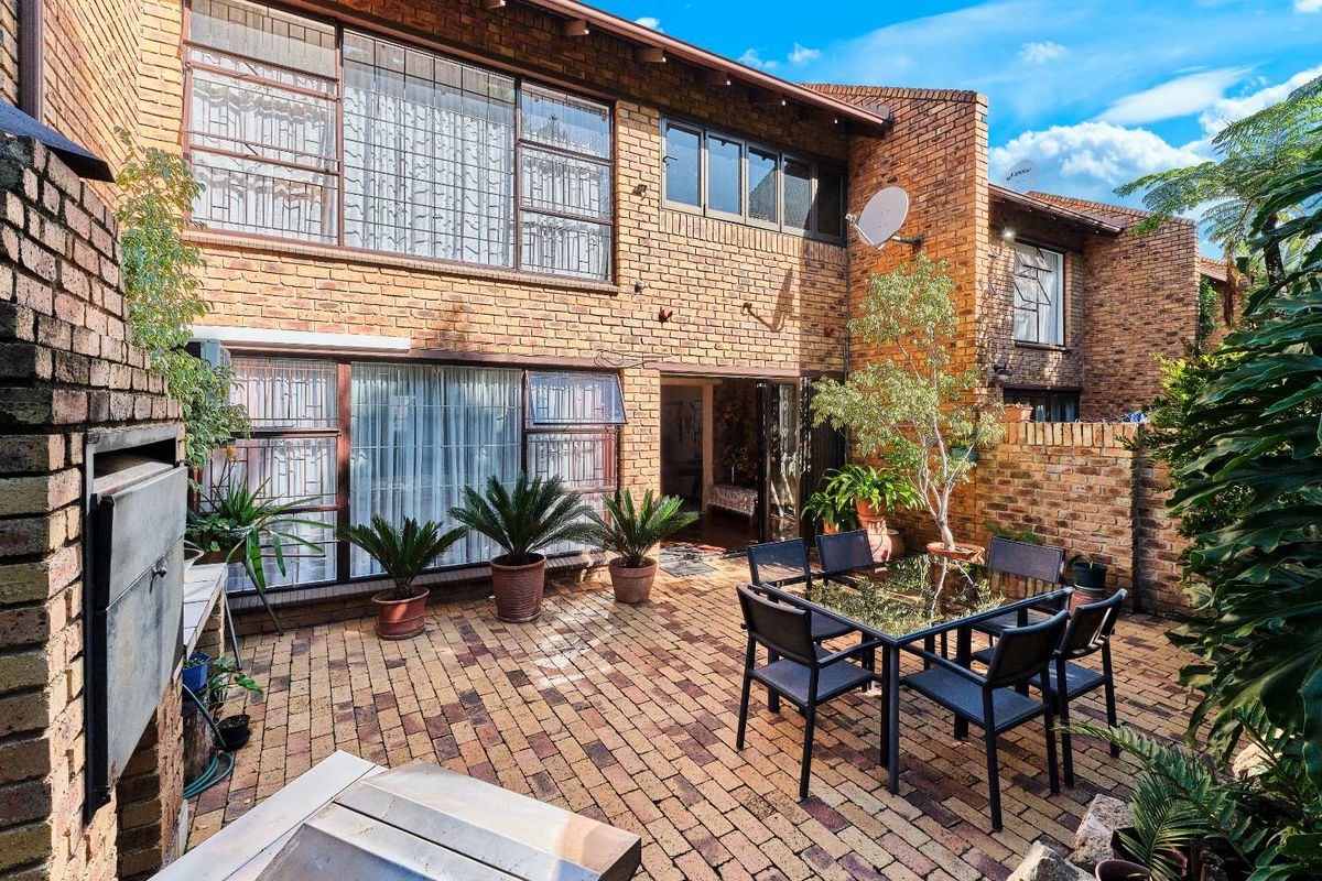 This spacious townhouse(200sqm), is nestled in a small, well-maintained and sought-after complex in Boskruin, Randburg. Boasting a generous open-plan layout, the downstairs living area includes a lounge (with under tile heating) and dining space that flows into a functional kitchen with space for three under-counter appliances, a double-door fridge, and plenty of cupboards. Also downstairs is a guest toilet and a versatile study nook that opens with stacking doors to a patio featuring a built-in braai, countertop, and small basin—ideal for entertaining and enjoying the serene garden and surrounding birdlife from the nearby Boskruin Koppie.