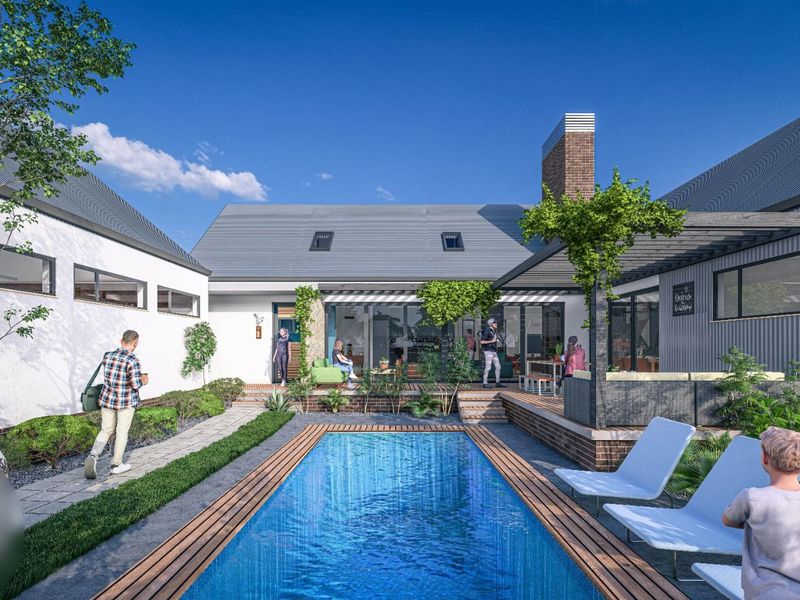 Live in light-filled contemporary family comfort in a peaceful neighbourhood, with open-plan kitchen and patio braai, three en-suite bedrooms, double garage and solar rainwater harvesting.