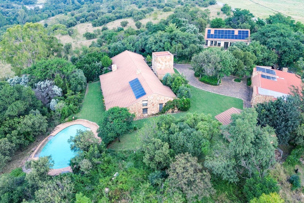 Hilltop retreat with Jukskei River frontage and sweeping views over Monaghan Farm, minutes from Lanseria Airport, featuring handcrafted stone buildings, infinity pool and guest cottages — eight bedrooms, three garages.