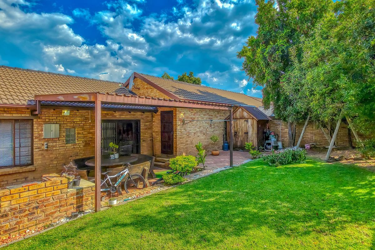 This beautifully presented home offers modern, open-plan living designed for comfort and easy entertaining. The contemporary kitchen is both stylish and practical, featuring sleek granite countertops, a built-in five-plate gas stove with an electric oven, an extractor fan, a double basin, and space for three appliances. There is an abundance of well-designed cupboard space, and the kitchen flows seamlessly into the spacious lounge area. The open-plan lounge is tiled throughout and filled with natural light. A striking feature wall adds character and warmth, making this an ideal space for relaxing evenings, movie nights, or hosting friends and family. The home offers two well-sized guest bedrooms, both fitted with laminate flooring and ample built-in cupboards. The modern guest bathroom includes a bath and shower combination, toilet, and basin. The main bedroom is generously proportioned and also features laminate flooring and built-in cupboards. It is complemented by a full en-suite bathroom, complete with a shower, bathtub, toilet, and basin, offering a comfortable private retreat. From the lounge, sliding doors lead out to a large covered veranda with brick paving. This inviting outdoor space is perfect for weekend braais or enjoying a quiet morning coffee. The wrap-around private garden is lush and well established, featuring fruit trees, including lemon trees, with both front and back garden areas to enjoy. Parking is well catered for with a double automated garage, as well as additional secure parking for two vehicles behind the garage, providing a total of four parking bays.