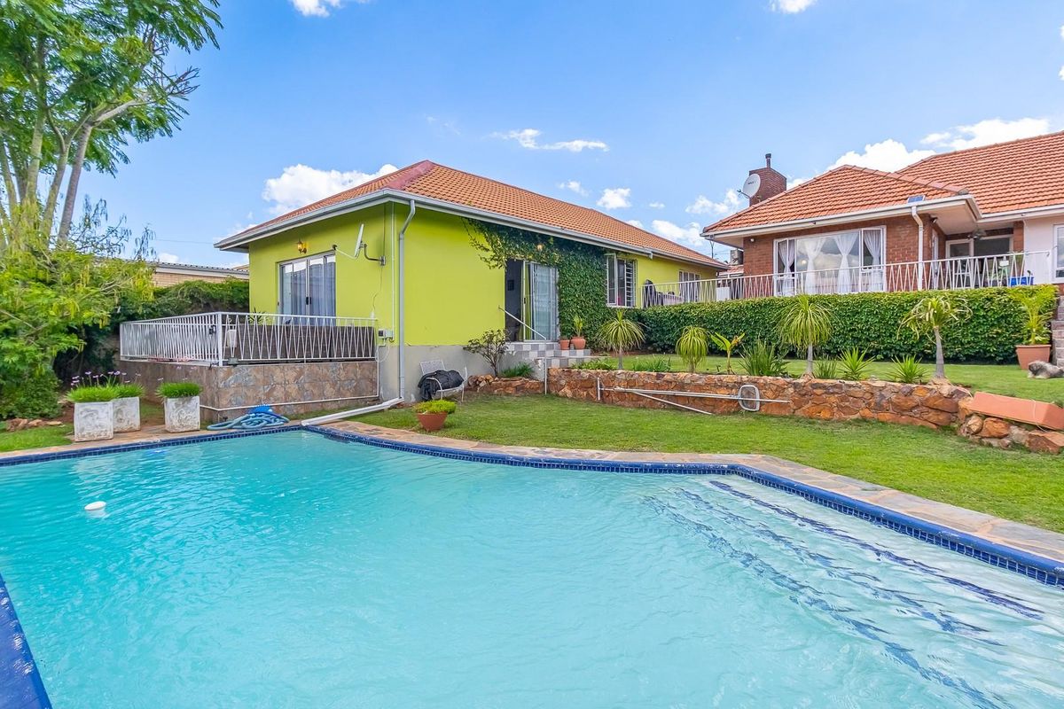 This beautiful property has an open-plan design that seamlessly integrates the lounge, dining, and kitchen areas. The kitchen has built-in cupboards and a scullery. It has a large patio suitable for family and social gatherings, a huge yard, and a stunning garden with a swimming pool.