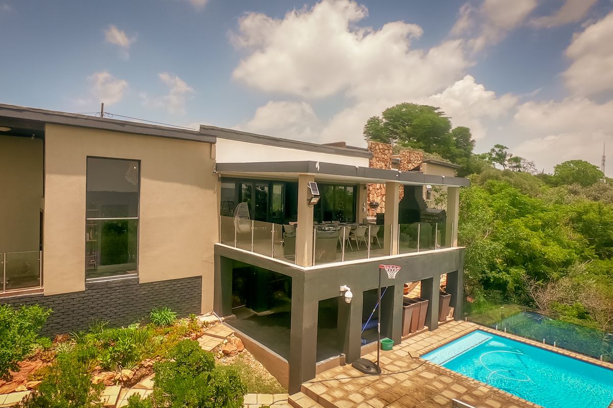 Relaxed family living in popular Wilropark with expansive 5,593sqm garden, pool and boma — main home plus 88sqm two-bedroom cottage. Three bedrooms, two bathrooms, double garage.