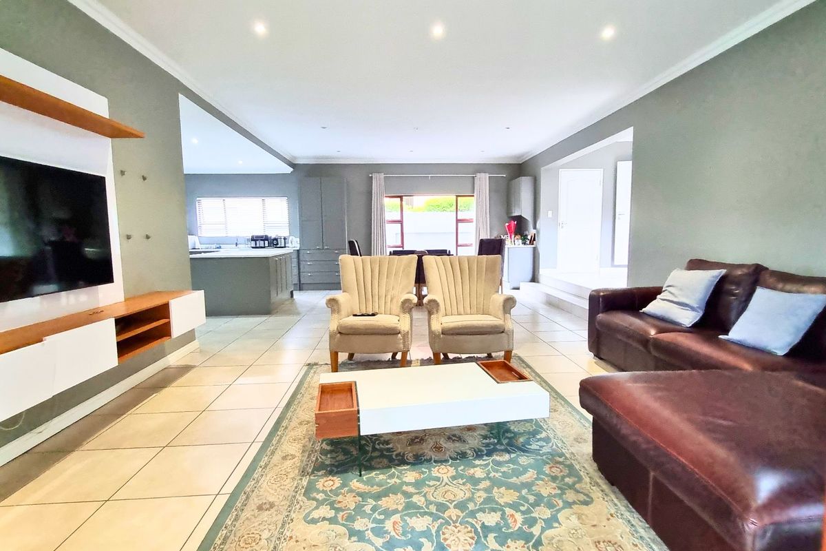The welcoming entrance hall leads into spacious, open-plan lounge and dining areas that flow effortlessly onto a private enclosed patio. Complete with a built-in braai that overlooks the pool and the garden.The stylish kitchen is the heart of the home featuring Caesarstone countertops, a center island, a gas hob, and a scullery.