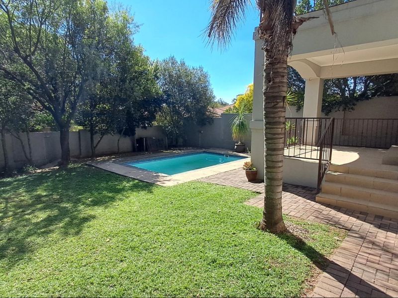 Poolside family living in Maroeladal, Fourways — secure estate near shops and top schools, covered patio with manicured garden and private pool; three beds, three baths.