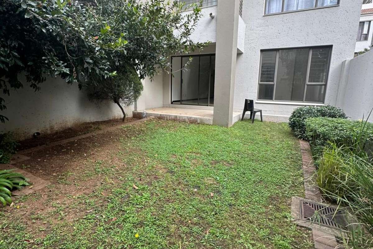 Relaxed Bryanston ground-floor living with large private garden and open-plan kitchen; secure 24/7 complex near Nicolway, Fourways and Sandton — ideal for a professional couple, 1 bed, 1 bath.