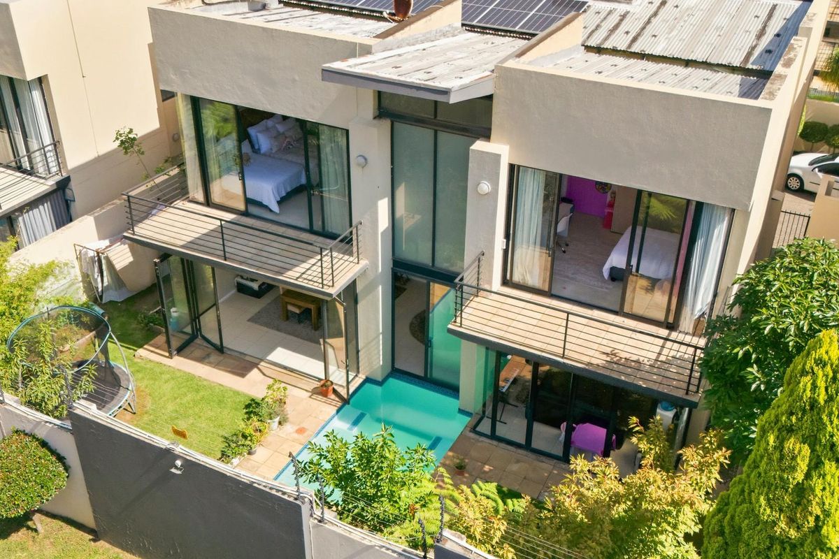 Set within a secure, access-controlled complex in sought-after Bryanston West, this stylish contemporary duplex townhouse offers a seamless blend of modern design and everyday comfort. The light-filled open-plan living space features a sleek, well-appointed kitchen that flows effortlessly into the dining and lounge areas, enhanced by high ceilings and stacking doors that open out to a private garden with a splash pool—perfect for relaxed entertaining and indoor-outdoor living. Thoughtfully designed for convenience and efficiency, the home also includes solar panels, an inverter system, and a backup water supply, ensuring uninterrupted comfort.