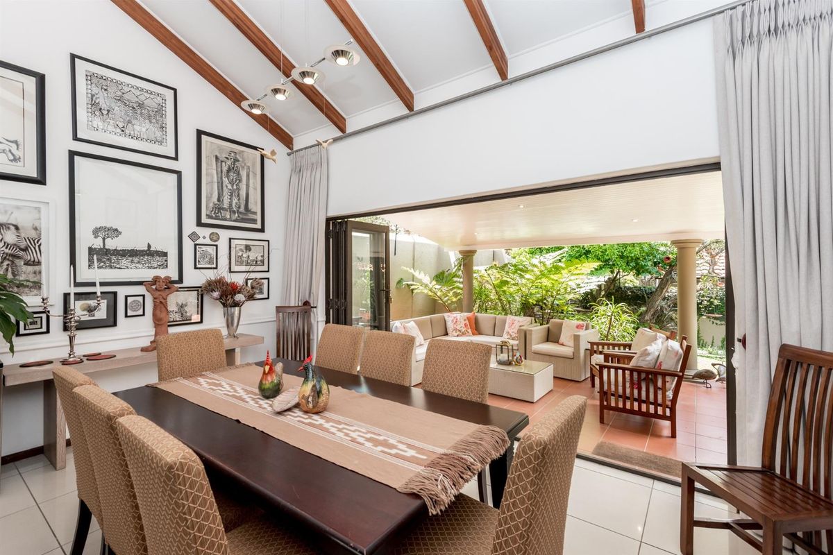 Lock-up-and-go lifestyle in Mill Hill boomed enclosure, Bryanston — entertaining flows from double-volume dining to covered patio and water-wise garden with built-in fireplace; three beds, 2.5 baths.