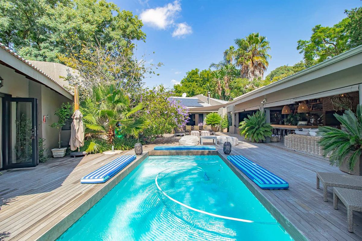 Entertainer’s sanctuary in Bryanston East on a private 2,700sqm stand, flowing to pool, tennis court and covered patios — sleek open-plan kitchen, four bedrooms, 4.5 baths, triple garage.