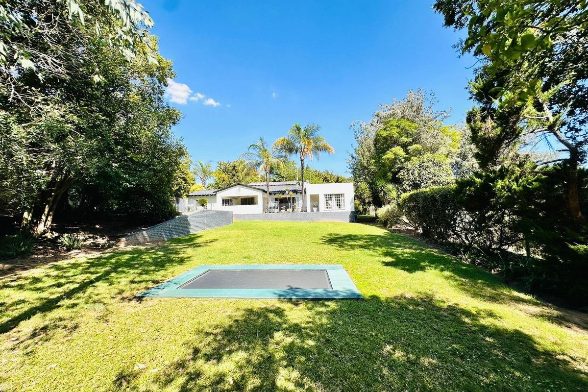 Family-focused living in the heart of Bryanston with expansive gardens and fenced pool, high-ceilinged lounge with bar, upstairs flatlet for guests or rental; four bedrooms, two bathrooms.