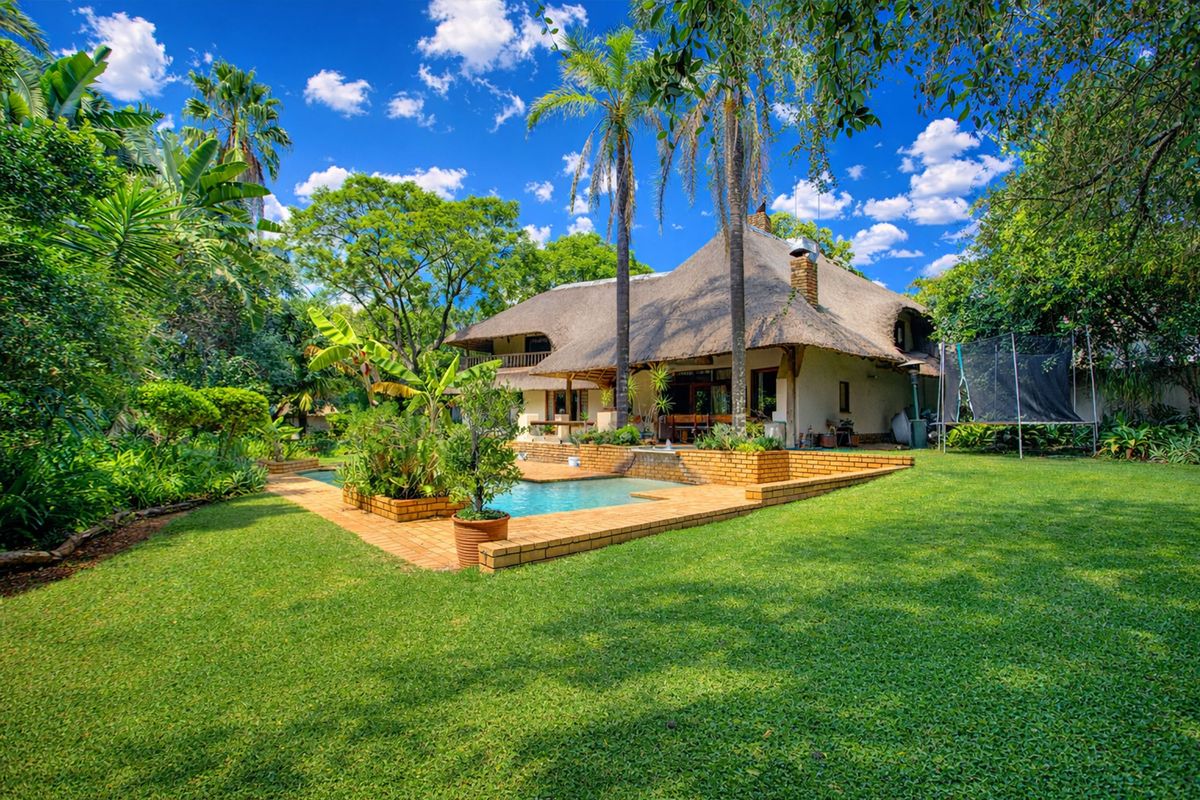 Entertainer's family retreat on secluded Portman Road in Bryanston's secure enclave, close to top schools and shopping. Mature gardens with pool and water feature; five bedrooms, two cottages.