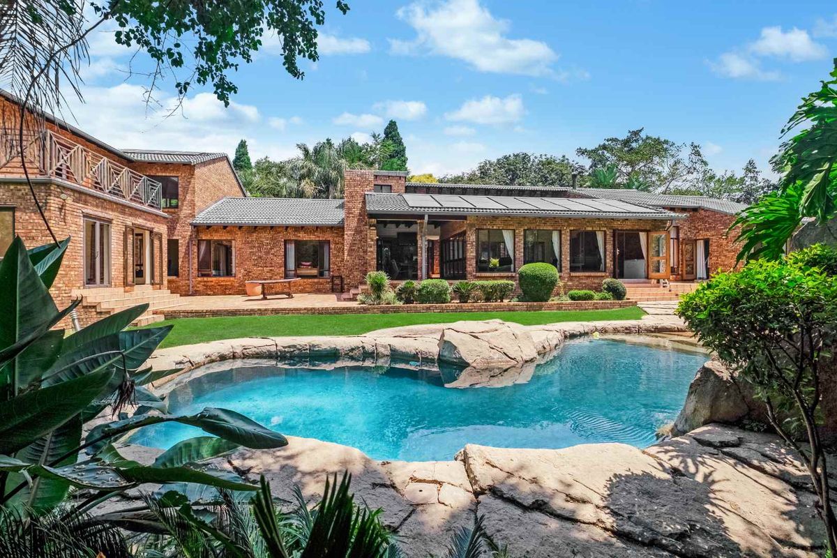 Effortless entertaining on a private 4,000m² Bryanston panhandle estate near Sandton and top schools, featuring a solar-heated pool, landscaped gardens and six-bedroom main plus cottage.