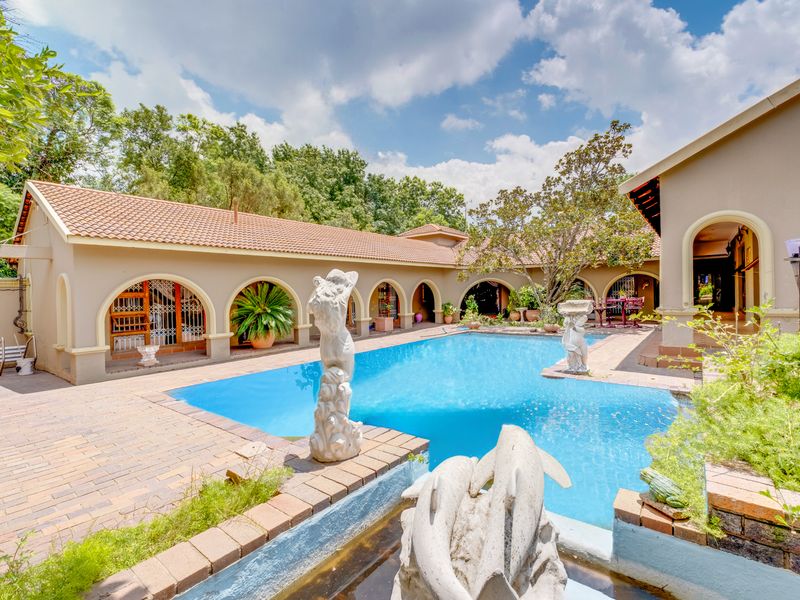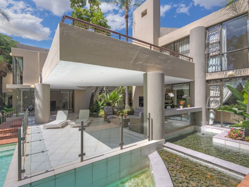 Resort-style living in Bryanston's secure Sandton enclave, with a central pool-entertainment courtyard and income-producing guest house — nine bedrooms, seven bathrooms, multiple garages.