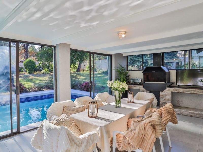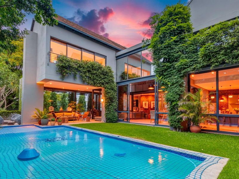 Entertainer's dream in Bryanston East, Sandton — secure gated enclave living with seamless indoor-outdoor flow, sparkling pool and bonfire area; five bedrooms, four bathrooms, double garage.