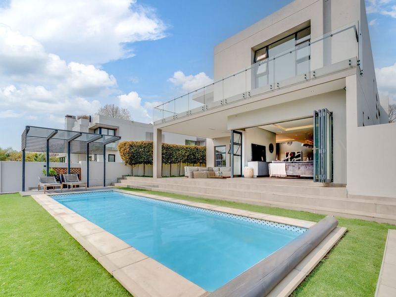 Entertainer's dream in Bryanston, steps from top schools and shops; alfresco kitchen and vast patios for seamless indoor‑outdoor living, plus four en‑suite bedrooms and double garage.