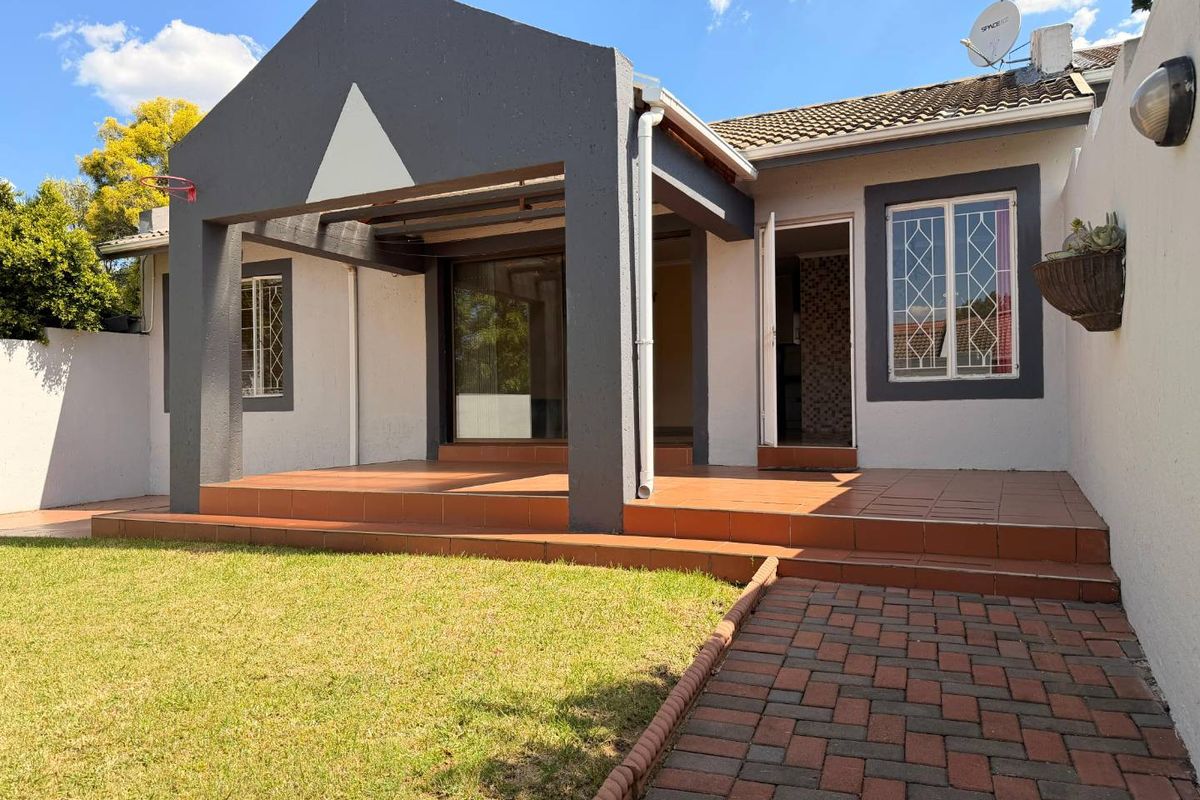 Relaxed Sandton living and effortless entertaining — covered patio with built-in braai opens to a manicured private garden in Buccleuch. Two bedrooms, two baths and single garage.