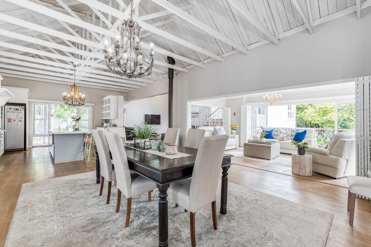 Nestled in the trees, on a beautiful corner stand in this pristine, tranquil Estate, is a gorgeous modern country home. This home has so much curb appeal and will capture your heart! The pretty entrance opens with a picture window view onto the garden. Stunning Oak flooring throughout the living areas, adds to the charm. There is a lovely lounge on the right, ideal for intimate entertaining and especially cozy with the fireplace for winter. The large double volume family room has a central fireplace that warms the entire living area. The dining room is open to the family room and kitchen and there is a lovely sun-room to add to the ambience of this beautiful home. There is a 5KVA inverter and 4 batteries.