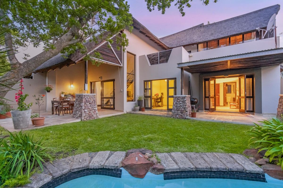 This charming, unique, and beautifully maintained thatched home in Sibiti Private Estate offers the perfect blend of nature and city convenience — ideal for those who love a bushveld feel while enjoying secure living in the suburbs. Set within a tranquil bush baby reserve, this pet-friendly estate (dogs only) provides a truly special lifestyle. The home features elegant screed flooring throughout most areas, with the main bedroom upstairs boasting a luxurious en-suite bathroom with a large shower, corner bath, and private patio overlooking the lush bush baby corridor. Downstairs, two spacious bedrooms open directly into the garden and are complemented by a full en-suite bathroom and an additional guest bathroom with a shower. The open-plan kitchen is both stylish and practical, featuring Caesar-stone countertops, a central island, gas hob, and space for two wet appliances. Flanked by the dining room on one side and a double-volume lounge on the other, the layout flows effortlessly from the heart of the home to a covered patio, ideal for both family living and entertaining.