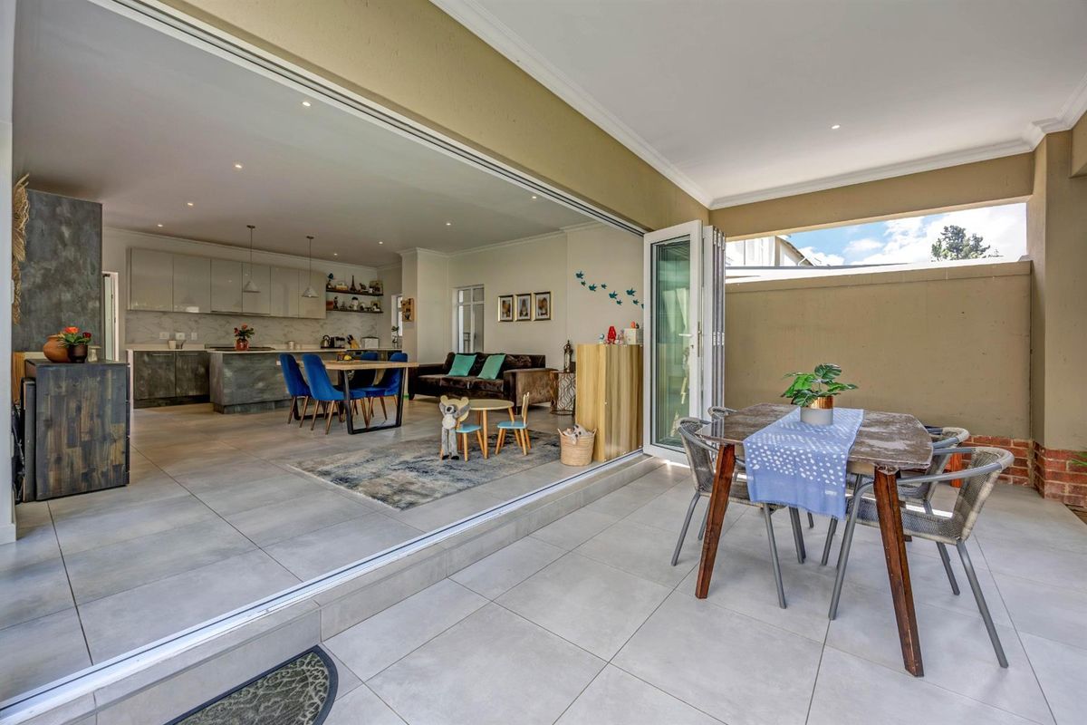 Relaxed family living in a quiet Fourways boomed alcove bordering Norscot Koppies, with a covered patio overlooking a private garden, modern kitchen, solar power, three bedrooms and double garage.