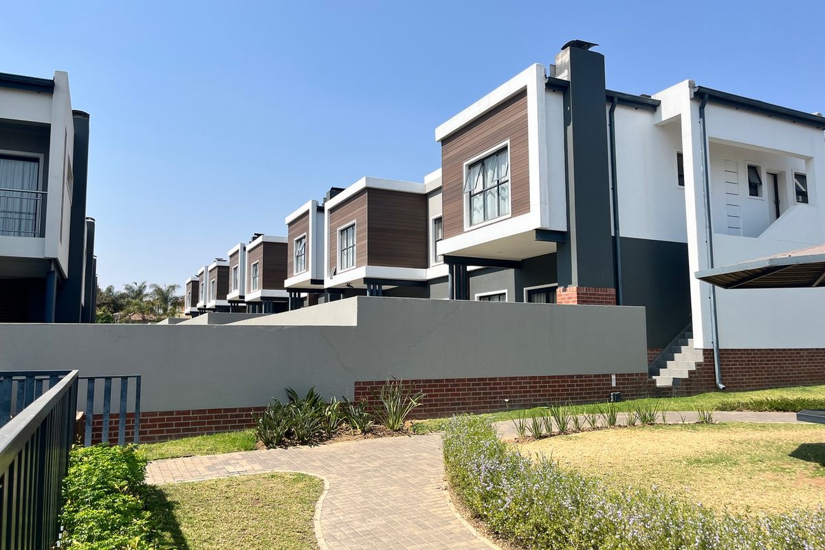 Entertainer's townhouse near Chili Lane and Sunninghill Hospital, featuring granite kitchen, private garden with built-in braai, balconies off bedrooms, inverter backup, communal pool; 3 beds, 2 baths, double garage.