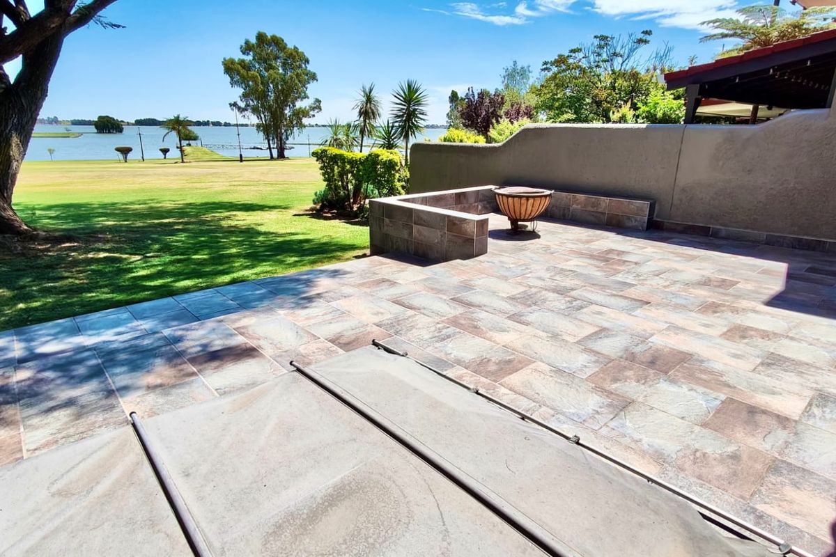 Peaceful dam-side lock-up-and-go living at Vaal Dam in a pet-friendly waterfront complex with boat launch; large tiled patio with built-in braai and sunken jacuzzi. 3 bedrooms, 3 bathrooms, double garage.