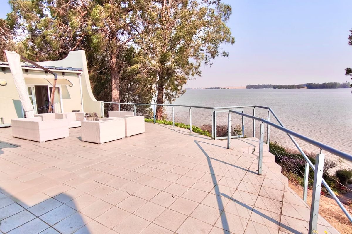 Exclusive Waterhaven Estate waterfront retreat on the Vaal Dam — panoramic water views, private boating garage with Panache 2150 and slipway, fully furnished and move-in ready. Four beds, three baths.