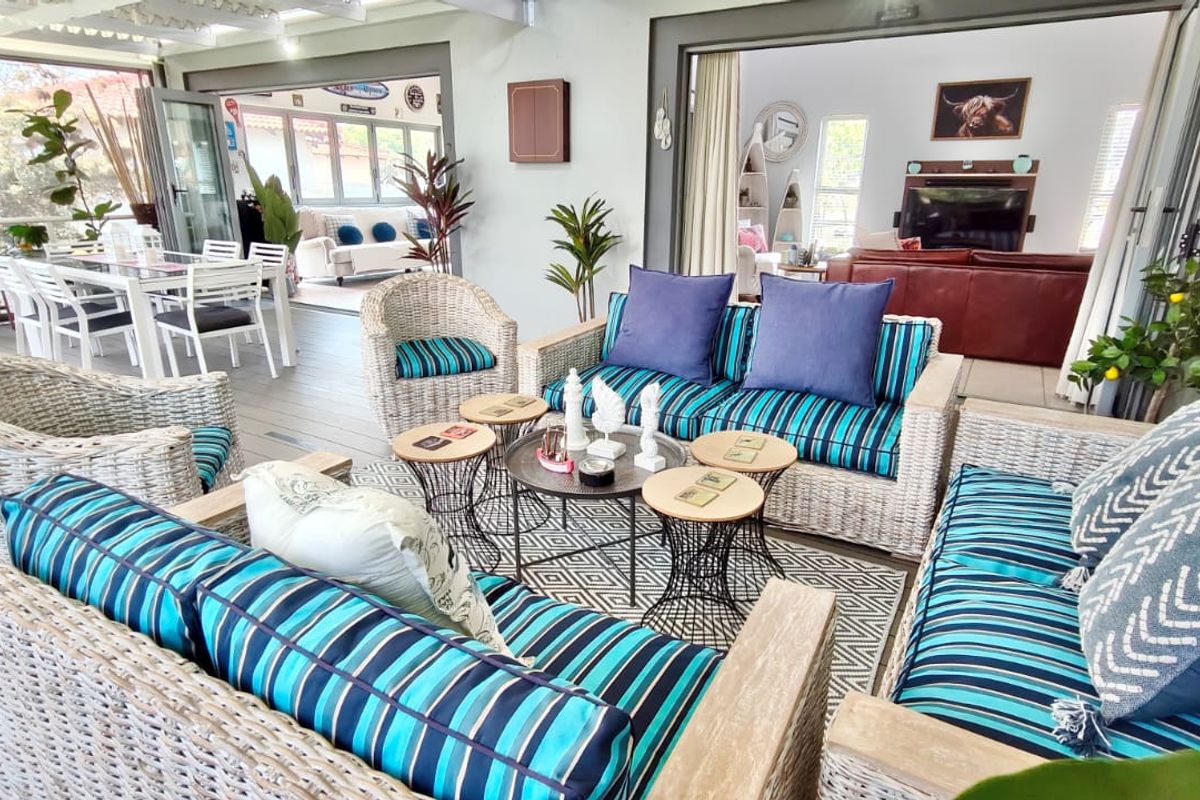 A spacious open-plan living area seamlessly flows onto a covered patio and enclosed braai room — perfect for year-round entertaining.