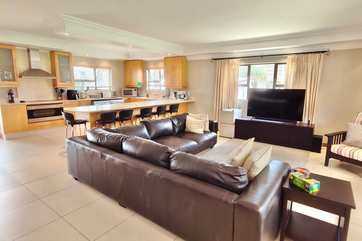 The home features a spacious, elegantly finished kitchen that flows seamlessly into an open-plan lounge and stylish bar area—ideal for both everyday living and entertaining. The living space extends into an enclosed patio, which opens onto a beautifully manicured garden and outdoor patio complete with a built-in braai, all perfectly positioned to take in the spectacular dam views.