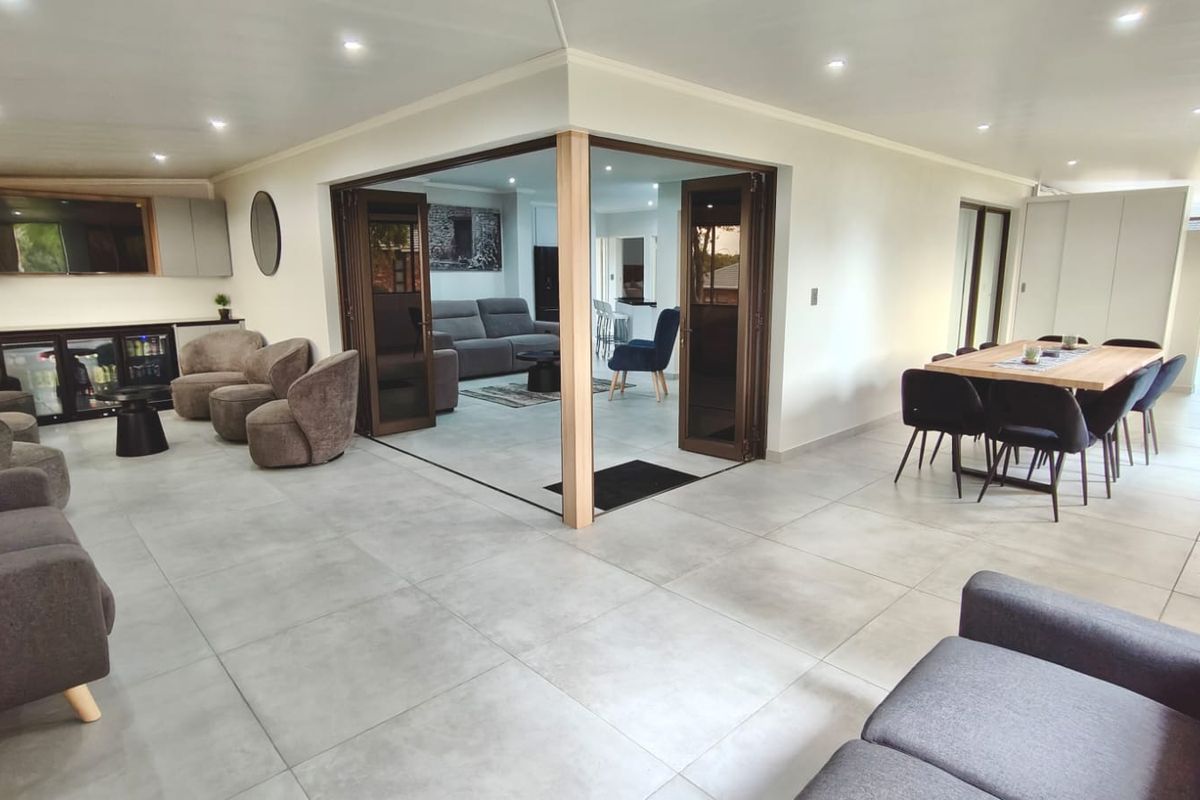 The home boasts a light-filled open-plan layout, where the lounge and contemporary kitchen flow effortlessly into a fully enclosed patio. Fitted with aluminium windows and doors, this versatile entertainment area features a built-in braai—creating the perfect space to host guests and enjoy year-round indoor-outdoor living, regardless of the season.