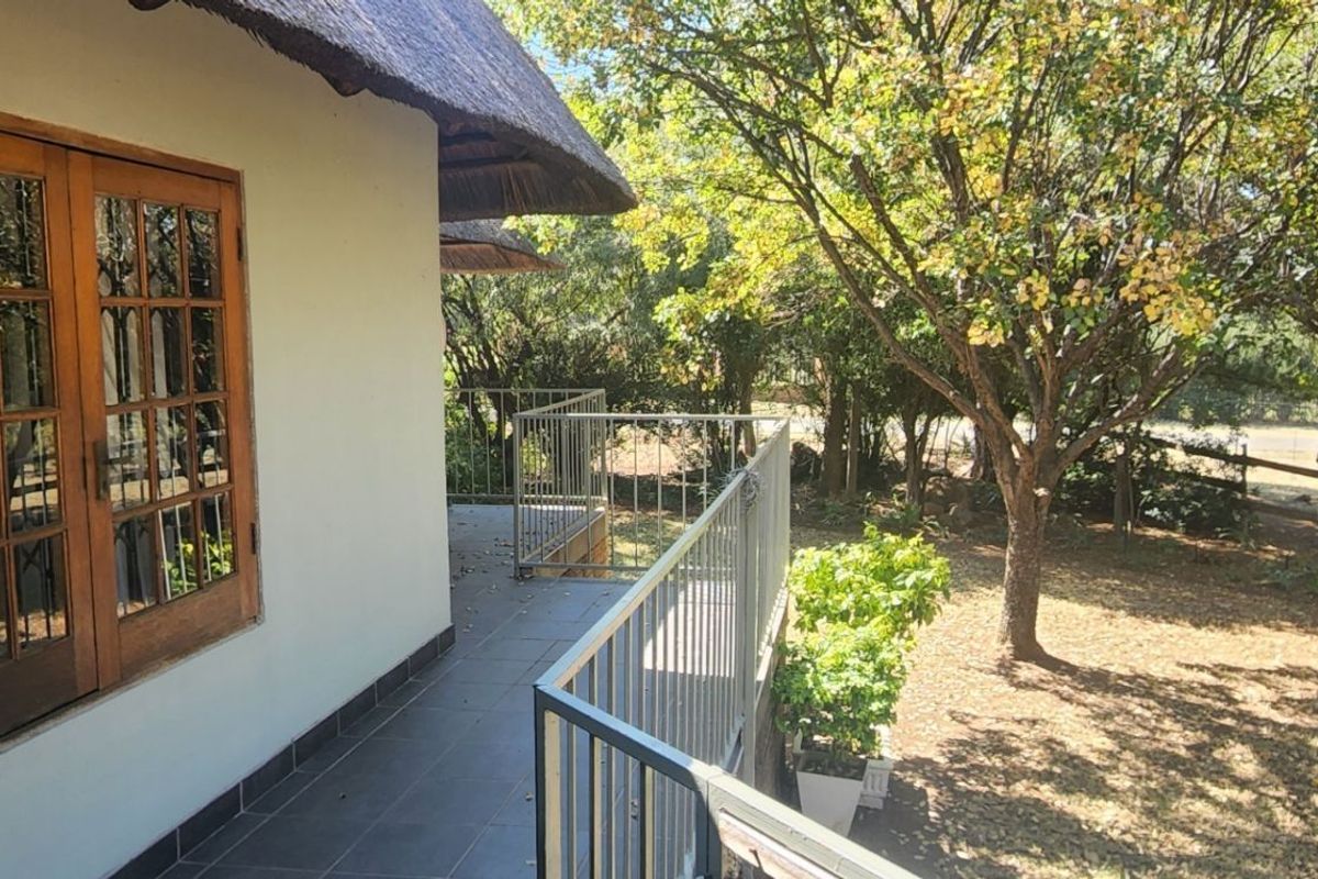 The open-plan living area is anchored by a wood-burning fireplace, ideal for cosy winter evenings. The well-appointed kitchen offers ample cupboard space, room for two appliances, and a walk-in pantry large enough for a double fridge, all set beneath a striking double-volume thatch roof that adds warmth, charm, and character throughout the home.