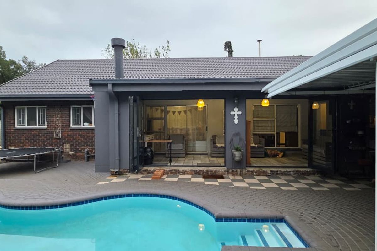 Easy entertaining opposite Emfuleni Primary School with a new indoor-braai entertainment area, sparkling pool and lapa; wooden kitchen, borehole irrigation and three bedrooms, two bathrooms.