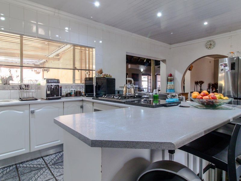 Family-focused living in Arcon Park, Vereeniging — spacious entertainer's garden with heated pool and undercover braai, study and outside kitchen complement four bedrooms, three bathrooms, double garage.