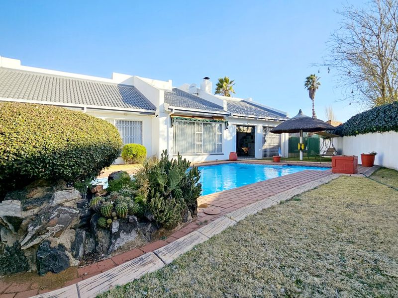 Peaceful neighbourhood entertainer's oasis with heated pool, heated jacuzzi and manicured private garden on 1000 m² — solar-powered with borehole, club house and flexible office/4th bedroom; 4 beds, 2 baths.